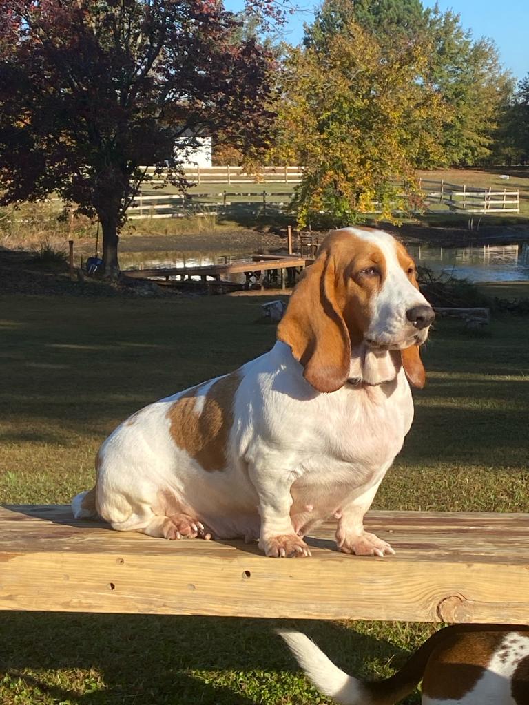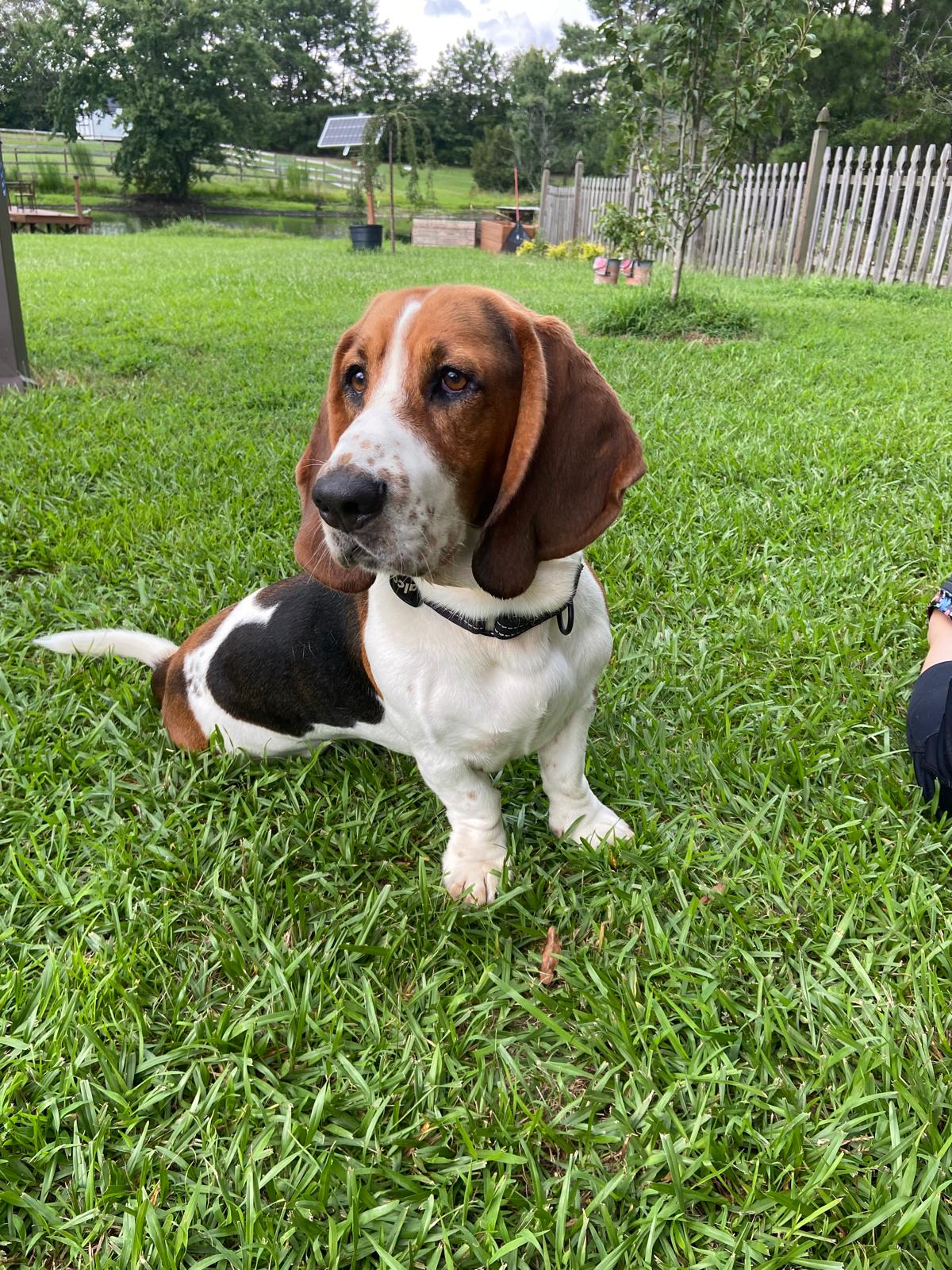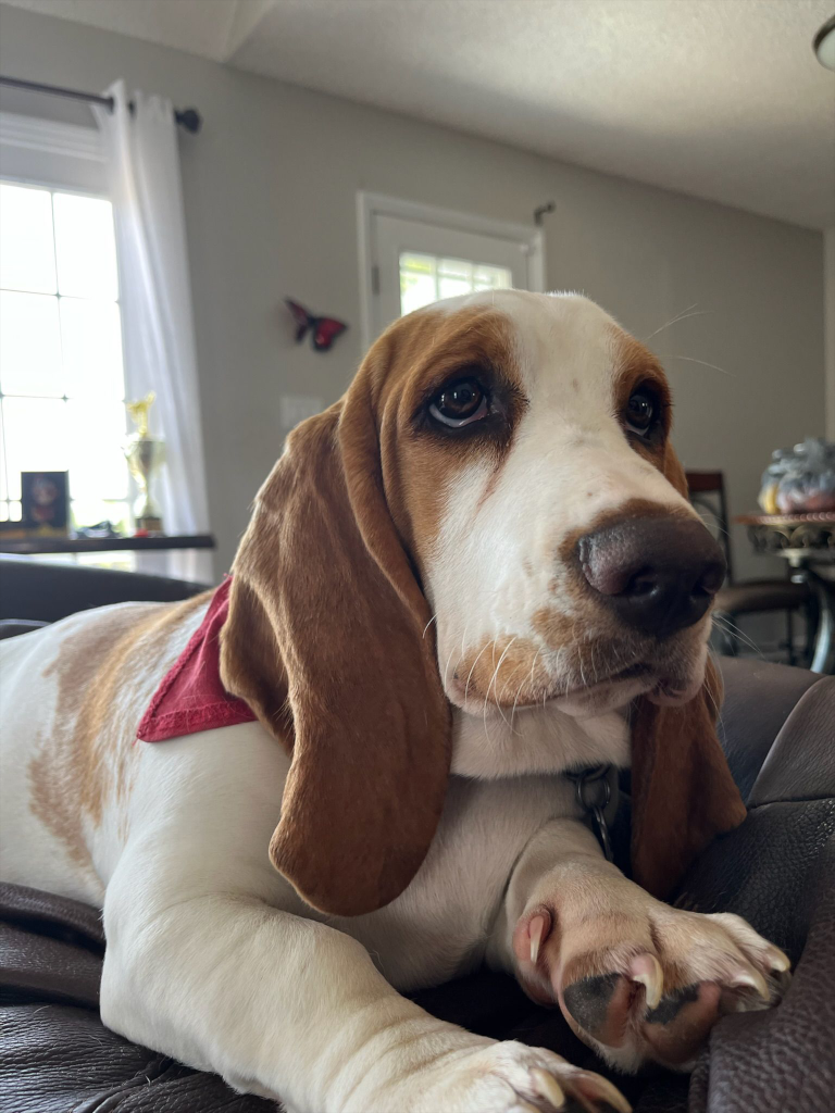 Lemon is a beautiful lemon and white basset hound. She is our grumpy mama with a big heart. She has no fear to anybody but she is the first to ask for a belly rub when she knows you. She has a beautiful conformation . Lemon is on a monthly wellness plan where she gets frequent vet visits . She is on monthly Simparica trio for flea, tick and worm prevention. She is on a diet of Purina Pro Plan 30/20. She has been genetically tested with Wisdom panel and has been cleared for over 200 inheritable diseases. Her report is available. Her results are registered on the OFA. www.ofa.org